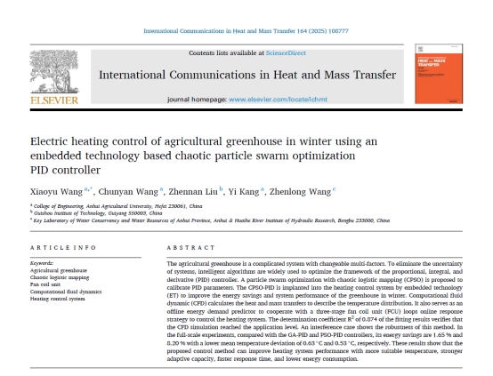 近日,热力学一区TOP期刊《International Communications in Heat and Mass Transfer》(IF=6.4)刊发我院王笑宇博士课题组在农业温室智能控制方法研究中的最新成果《Electric heating control of agricultural greenhouse in winter using an embedded technology based chaotic particle swarm optimization PID controller》。针对内外部环境复杂多变的农业温室系统,智能算法被广泛用于优化PID控制器的框架结构,以消除系统的不确定性。该研究提出了基于混沌逻辑映射的粒子群优化方法(CPSO)来整定PID参数。通过嵌入式技术将CPSO-PID植入到温室采暖控制系统中,提高温室冬季的节能效果和系统性能。计算流体力学(CFD)通过计算传热和传质来描述温度分布。它同时还作为离线的能源需求预测工具,与三级风机盘管回路的在线响应策略协同控制供热系统。结果表明:CFD的模拟精度达到了应用水平。通过加入信号干扰,验证了该方法的鲁棒性。在全尺寸试验中,与GA-PID和PSO-PID控制器相比,提出的方法在节能效果和控制温度的稳定性方面均有一定的改进。研究成果可为冬季温室系统提供更适宜的温度、更强的自适应能力、更快的响应速度和更低的能耗。
