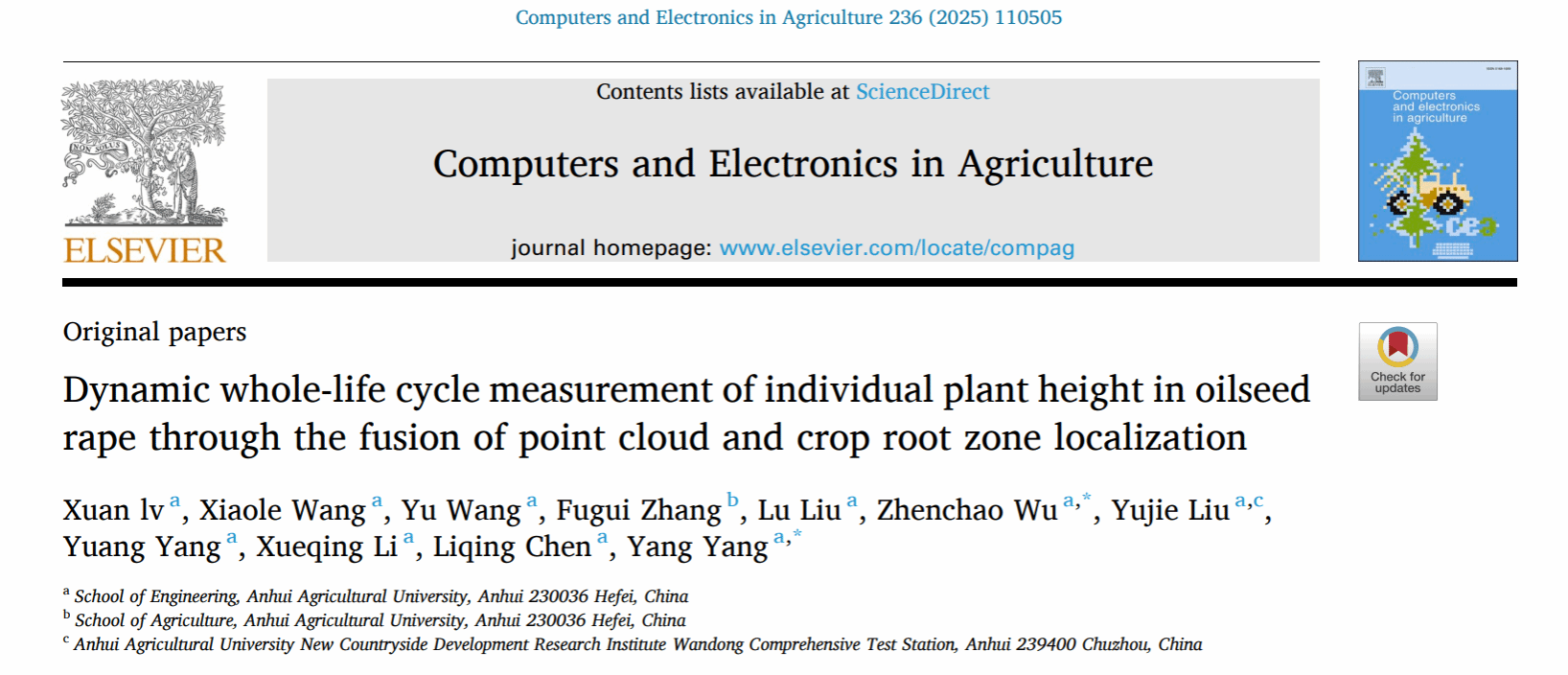 本网讯 近日,我院2022级车辆工程专业吕轩同学在农业信息领域国际权威期刊《Computers and Electronics in Agriculture》(中科院一区TOP,IF=7.7)上发表题为“Dynamic whole-life cycle measurement of individual plant height in oilseed rape through the fusion of point cloud and crop root zone localization”的研究论文。学院陈黎卿、杨洋、刘路、王笑乐和武振超等教师参与指导,新农村发展研究院皖东综合试验站为我院本科生人才培养提供试验保障。