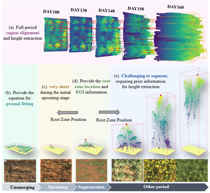 油菜的植株高度(PH)是一个关键的表型指标,单株作物全生命周期高度的准确获取可以为苗情诊断和育种选种提供有力的数据支持。然而,油菜进入花期后,叶片和枝条相互遮挡严重,精准获取单株植株的高度是非常困难的。论文提出“点云融合-根域定位”双模态测量技术,利用搭载激光雷达和北斗差分定位系统的桁架式导轨平台采集田间油菜群体的高时序性原始数据。使用针对单视角点云改进的快速欧式聚类算法对油菜返青期的油菜个体点云进行分割,随后通过目标函数提取油菜的根区位置,并生自适应植物包络区域(PEA)。在每个植株对应的PEA内,精确地定位播种时的地面位置和不同生长阶段的冠层顶点,从而能够在整个生命周期中自动提取单个植株的PH。论文攻克油菜个体植株全生命周期动态株高精准测量难题,为作物种质资源鉴定提供算法支撑。
