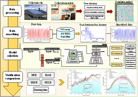 《Short-term photovoltaic power prediction based on FCformer-BiTCN method》论文:面向光伏阵列功率数据的不确定性、随机波动及噪声干扰问题,构建了一种融合傅里叶卷积的双向时间卷积网络(FCformer-BiTCN)的光伏阵列功率预测方法。采用蜘蛛蜂方法优化的Savitzky-Golay与小波阈值双滤波方法自适应平滑数据并去除噪声;设计FC网络融合FFT与残差连接,提取光伏阵列功率数据的时频混合特征;基于增强Informer的 ProbSparse 自注意力机制与编码器的蒸馏层完成时频特征维度压缩;通过双向扩张因果卷积对输入序列进行双向扫描,捕捉光伏阵列数据的长程依赖关系,实现光伏阵列功率序列的短期预测。该研究可为电网仿真调度、光伏基站智能运维与故障预警提供理论依据。论文第一作者为2022级本科生丁立,李庆副教授为通讯作者,河海大学陈翔博士参与论文研究。