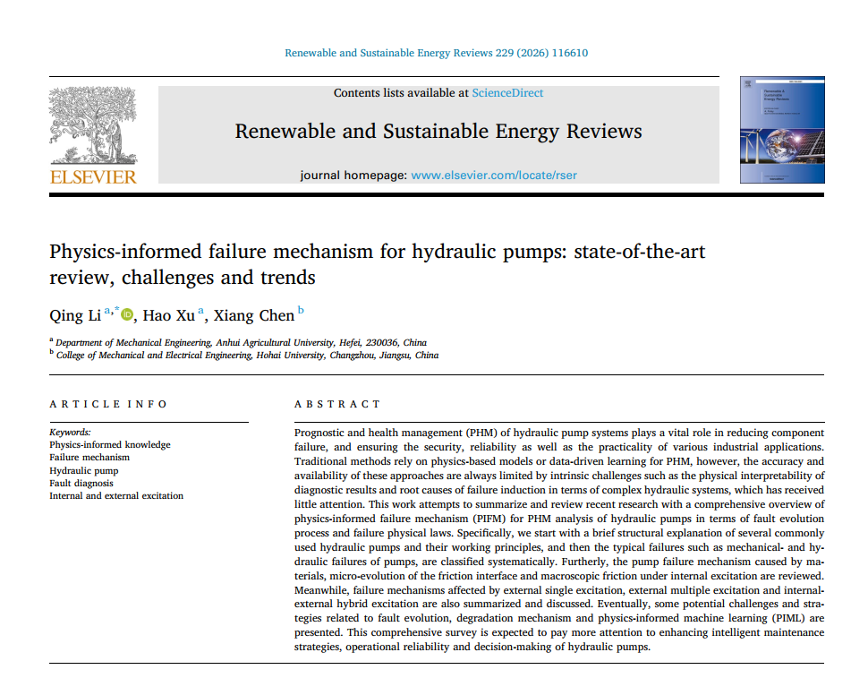 《Physics-informed failure mechanism for hydraulic pumps: state-of-the-art review, challenges and trends》论文:从液压泵系统故障演化过程与失效物理规律出发,系统梳理和总结了物理信息失效机制在液压泵故障演化机理、故障诊断与健康运维等领域的研究进展。重点阐述了材料特性、摩擦界面微观演化及内激励下宏观摩擦行为引发的液压泵失效机制,同时探讨单激励、多激励及内外混合激励与极端工况下的液压泵系统失效机制,为液压泵系统智能故障诊断、智能维护决策及精准健康管理提供新的研究方向。论文第一作者为李庆副教授,24级硕士生许浩与河海大学陈翔博士参与论文研究。
