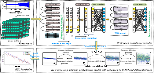 《New generative end-to-end RUL prognostics of bearings based on pretrained conditional temporal diffusion network》论文:针对传统旋转机械的剩余使用寿命(RUL)数据分布不均衡、样本量有限、生成式模型的模式崩溃等瓶颈问题,提出一种生成式端到端预训练条件时间扩散网络的轴承剩余使用寿命预测方法。模型训练过程围绕“RUL比率标签设计、Min-Max归一化处理、预训练条件编码器模块训练、扩散模型(增强 1D U-Net残差块)训练与差异化损失函数优化”五阶段展开,结合轴承退化物理先验的条件注入与反向去噪迭代优化,完成轴承退化过程的剩余使用寿命精准预测。论文第一作者为李庆副教授,23级硕士生孙强与24级硕士生许浩参与论文研究。