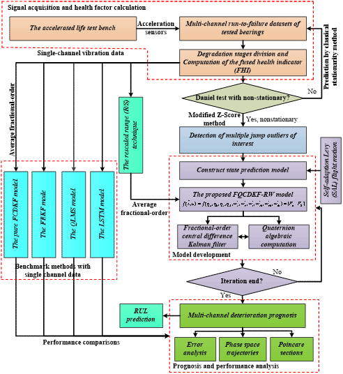 《Fractional quaternion central difference Kalman filter with random walk motion for deterioration prognosis of rolling bearing with multiple jump outliers》论文:由于旋转机械装备服役退化缓变过程的非线性、多跳变以及尖峰厚尾分布特性,传统物理基与数据驱动方法难以精准捕捉上述退化特征,导致装备的剩余寿命(RUL)预测稳健性差。提出一种融合随机游走的分数阶四元数中心差分卡尔曼滤波新方法,同时引入自适应Levy飞行策略,且考虑了多通道退化数据的时空耦合关系,在不增加系统差分阶数的前提下降低线性化误差,最后结合Daniel检验、改进Z-Score方法与庞加莱截面检测多跳变异常值,可准确预测装备服役退化趋势。两套案例结果证明该方法可显著提升模型对复杂分布数据的适配性与鲁棒性。该方法可为旋转机械装备健康运维在小样本自适应预测、容错控制与工业复杂环境的模型泛化能力提升提供良好的理论基础。李庆副教授为论文唯一作者。