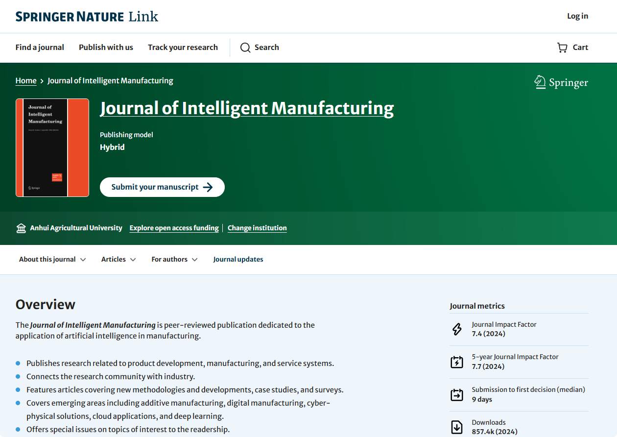 《Journal of Intelligent Manufacturing》是一本由Springer出版的刊物,创刊于1990年,主要报道人工智能在制造业的前沿进展与新兴领域的原创研究,最新影响因子为7.4,为中科院二区期刊。期刊在数字制造、信息物理系统与人工智能等交叉领域享有较高的知名度和引用影响力。