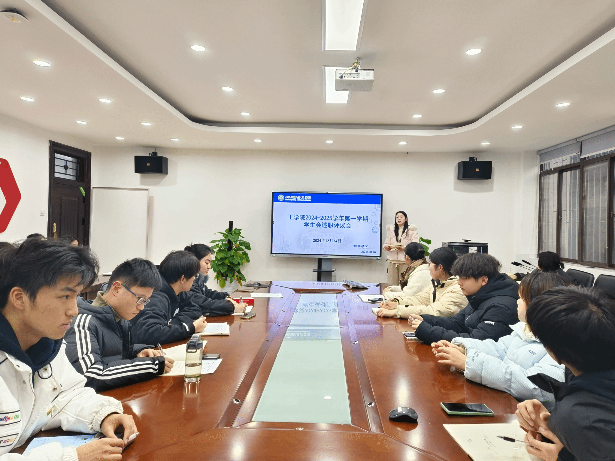 本网讯 12月24日下午,工学院学生会开展2024-2025学年第一学期述职报告会,学生会主席团成员、各部门负责人参会。学院团委老师主持会议。