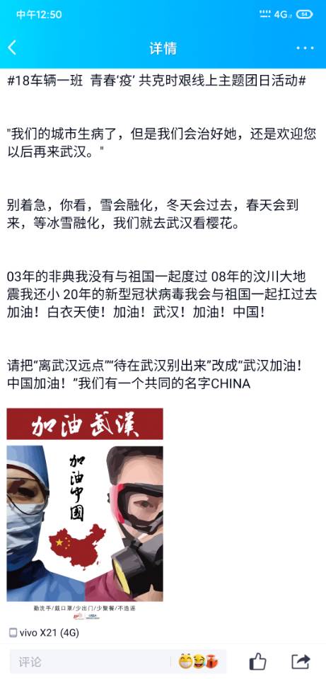 除此之外,学院团委、学生会积极组织开展青春战“疫”共克时艰线上主题海报大赛,开展“武汉加油”网络祝福活动和读书创作活动,让学生“宅在家中”过得“有声有色。