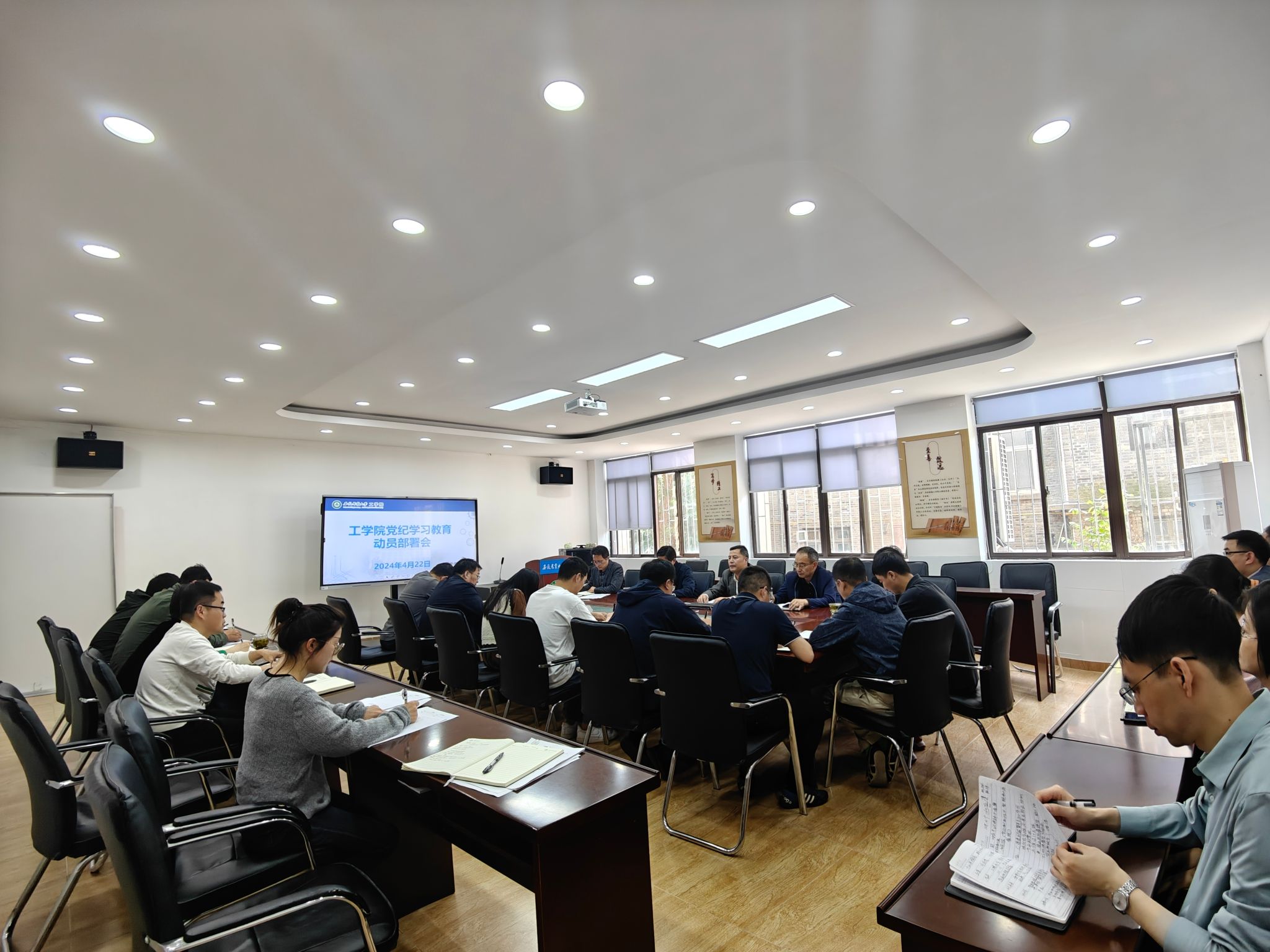 4月22日,学院召开党建工作专题会部署党纪学习教育工作,院党委委员、纪委委员、党支部书记、系部(中心)主任参加会议,学院党委书记张国学主持会议。