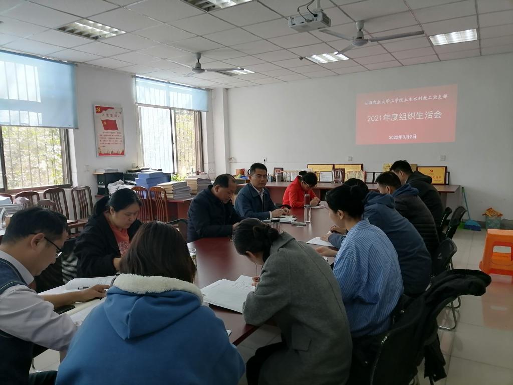 本网讯 3月9日下午,工学院土木水利教工党支部在三教217召开2021年度组织生活会并开展民主评议党员工作,副院长姚兴贵到会指导,会议由支部书记杨智良主持。